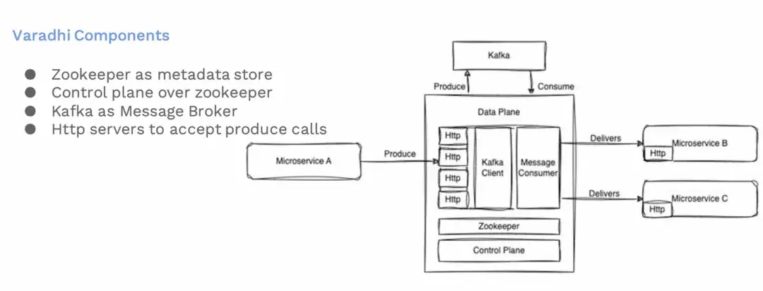 這是Varadhi的組件架構圖。其中ZooKeeper 維護元數據。我們有一個控制平面,允許用户配置他們的訂閲主題和端點,以及設置他們要從哪裏接收消息。我們還有個HTTP服務器,這些服務器處理來自用户的生產請求。這些生產請求隨後被持久化在消息代理中。