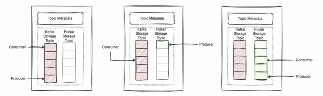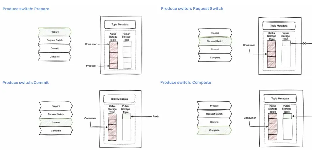 如果出現失敗,例如在請求步驟中,生產者指向了 Pulsar 上,但無法生產消息。這時候將重置切換,生產指針將回到 Kafka 主題,並開始只向 Kafka 發送消息。整個操作將被標記為完成,但狀態為失敗。