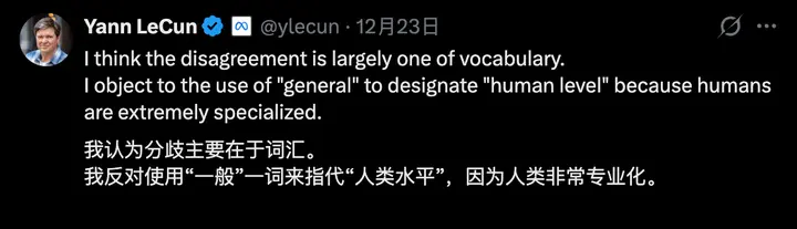 楊立昆對此迴應稱:我認為分歧主要在於用詞。他表示自己反對用“通用(general)”一詞來指代“人類水平”,因為人類是高度專業化的。