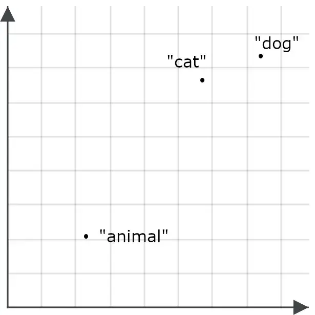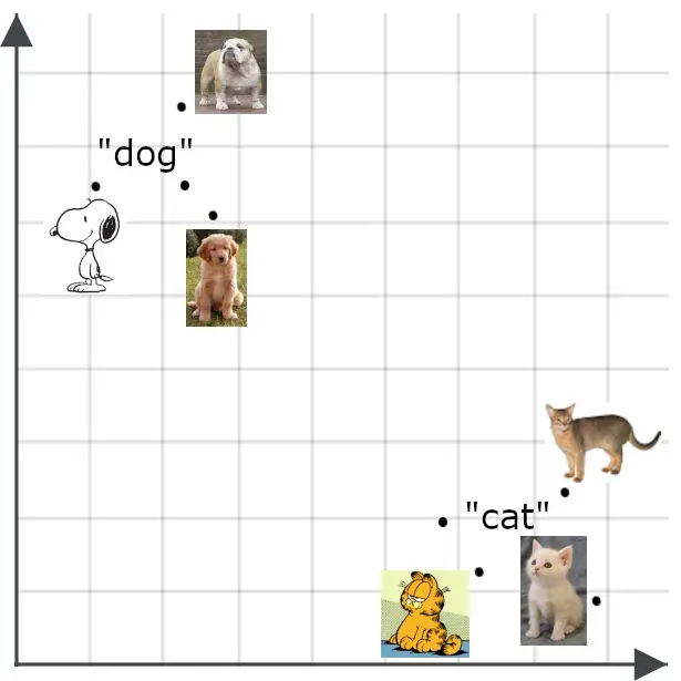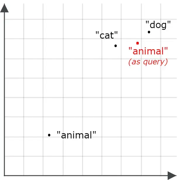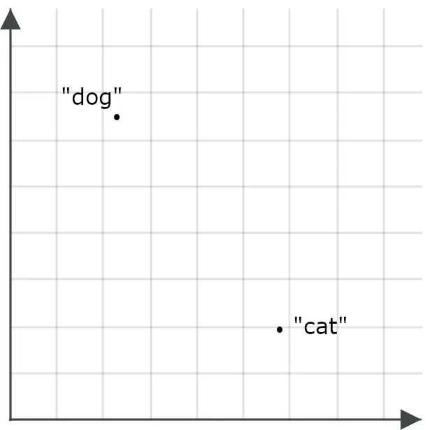 為了理解這對搜索應用為何重要,可以想象單詞 “ dog ” 和單詞 “ cat ” 各自對應為空間中的兩個點: