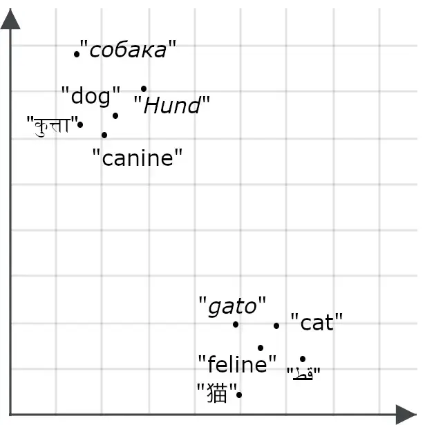 一個好的嵌入模型應該為單詞 “ feline ” 生成一個比 “ cat ” 更接近、而不是 “ dog ” 的嵌入,而 “ canine ” 的嵌入也應該比 “ cat ” 更接近 “ dog ”,因為這些詞的含義幾乎相同:如果模型是多語言的,我們也會期望 “ cat ” 和 “ dog ” 的翻譯具有同樣的效果:
