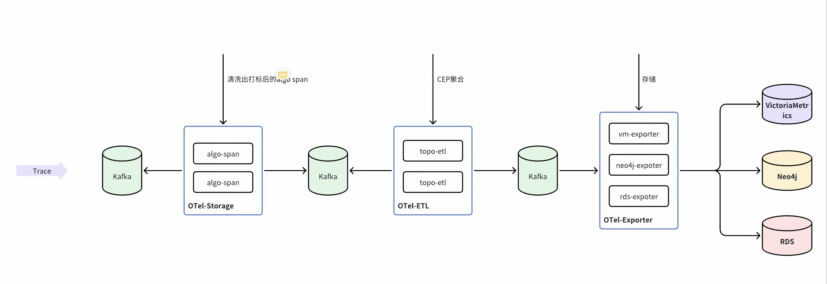 前面構造了以"場景"為中心的算法域調用指標,後面構造怎樣的數據模型決定了用户從什麼角度去觀察和分析數據。我們摒棄了不夠直觀的傳統的表格式展示,藉助強大的圖數據存儲數據庫Neo4j,實時存儲和更新算法場景的算子調用拓撲圖。實時調用指標關係存儲時序數據庫Victoriametrics,實時調用關係存儲Neo4j。