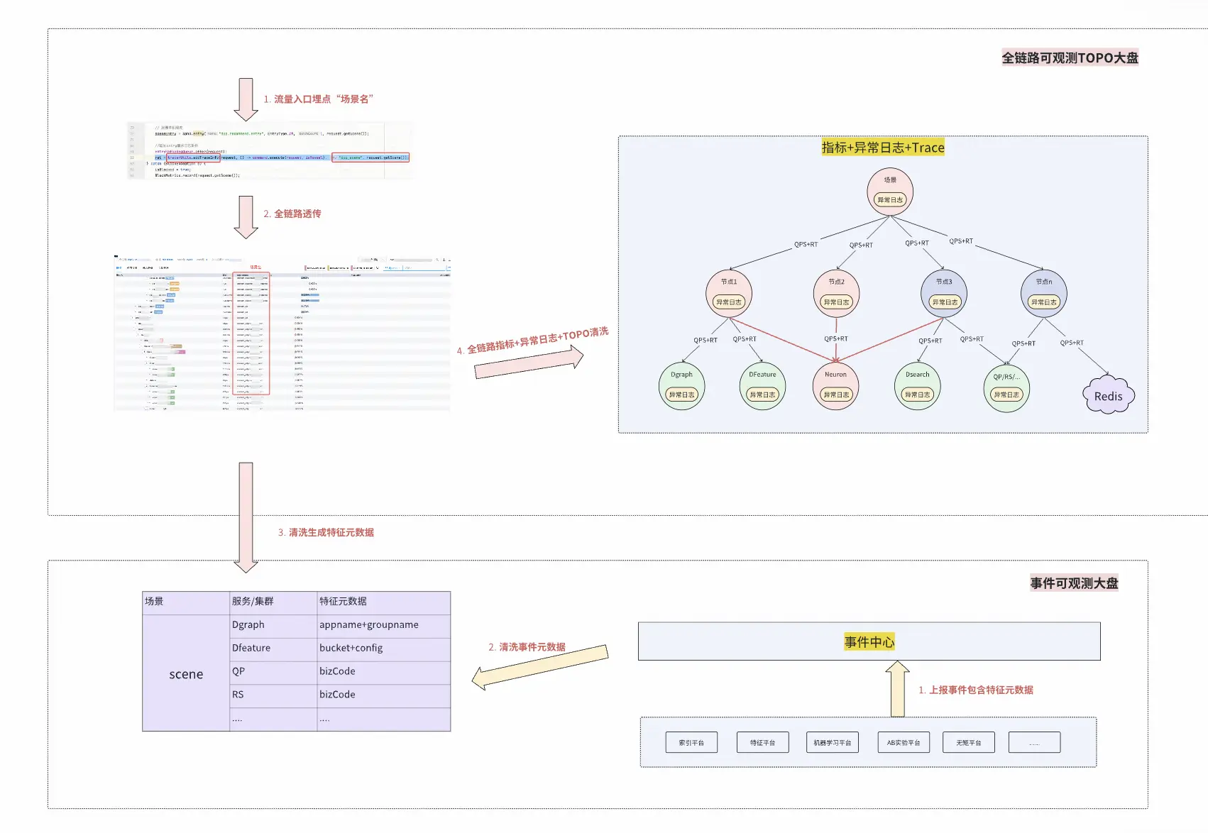 在業界,可觀測性通常被定義為Trace、Metric和Log三位一體。我們的目標是打造一套 "以場景為魂,以聯動為骨" 的可觀測體系,打破數據孤島,實現算法治理的智能化轉型。提出了 "四大支柱聯動":