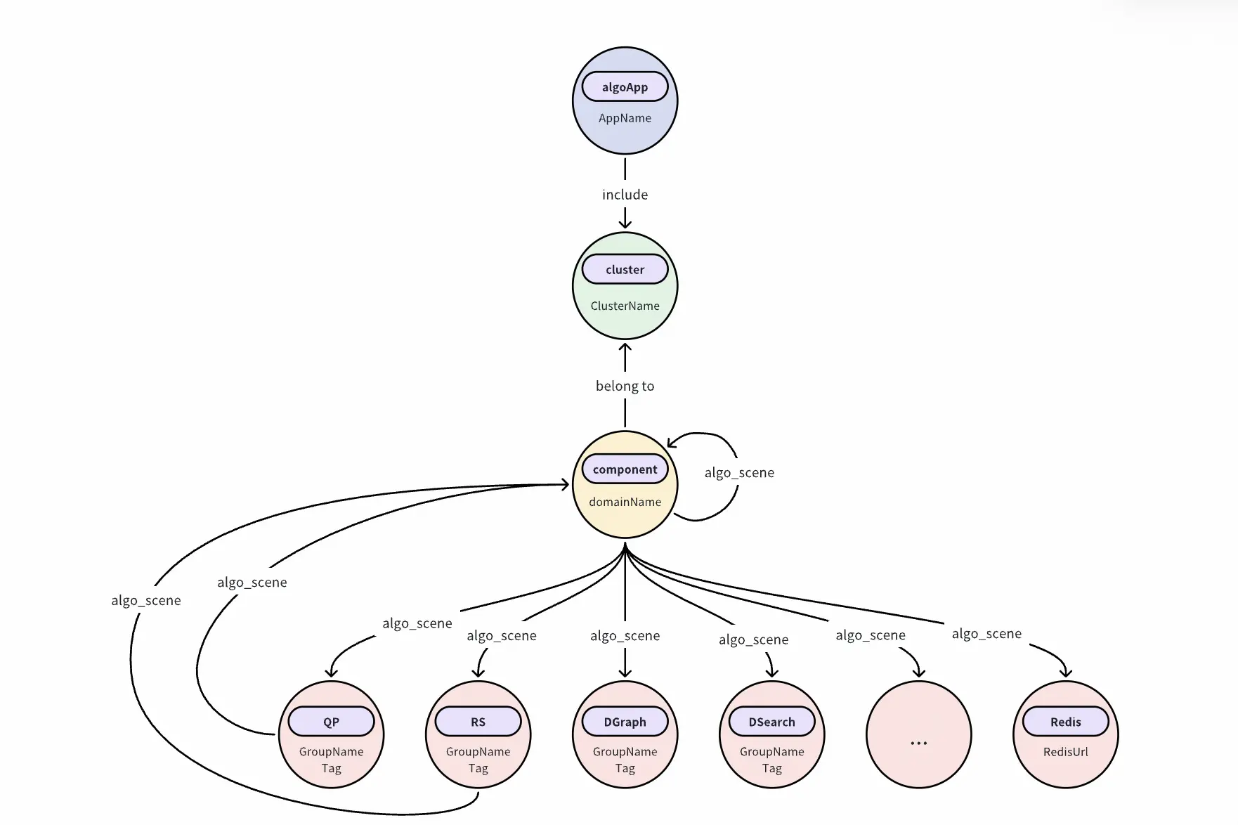 - 屬性(Properties):存儲在節點和關係上的鍵值對,如:appName、clusterName、scene、componentName、updateTimestamp等