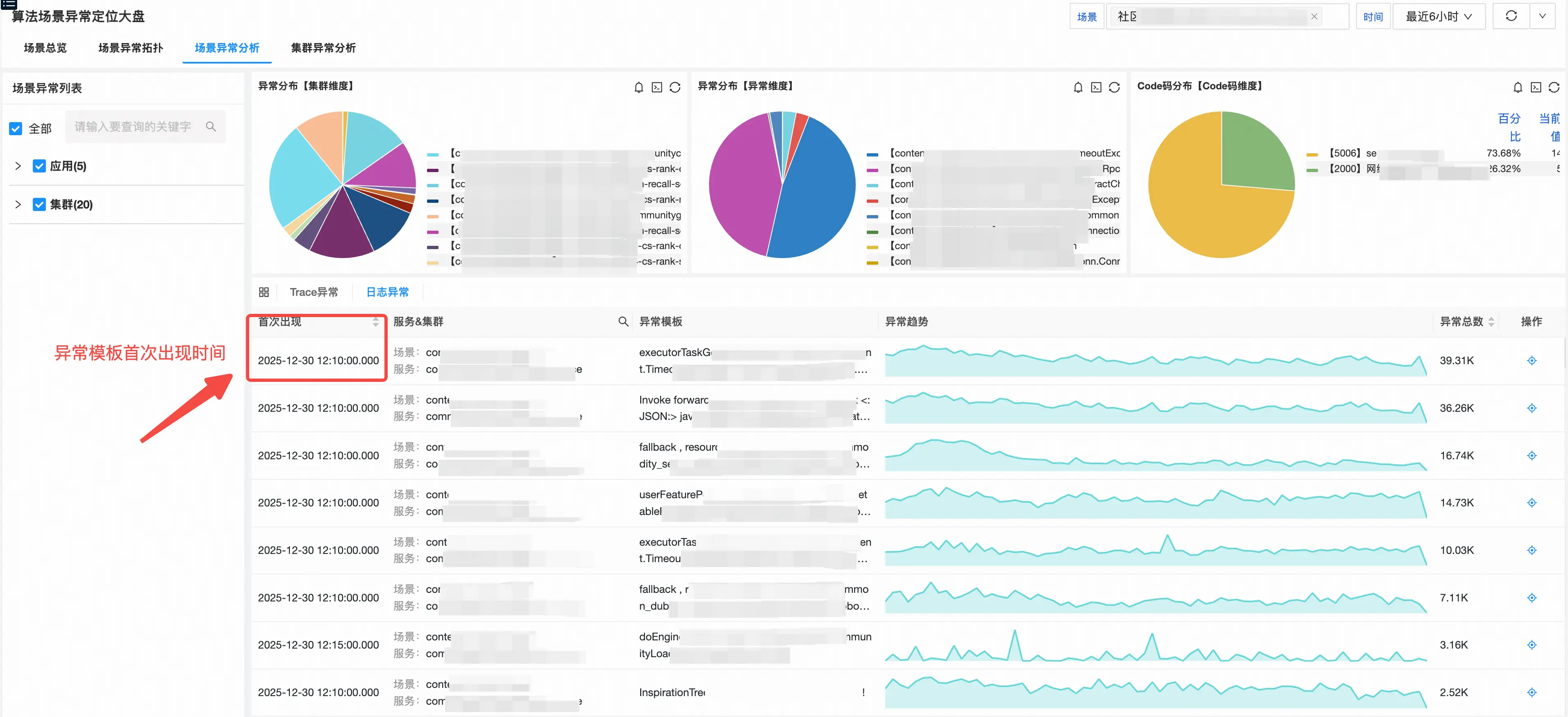 日誌模板聚類維度支持:應用名、集羣名、異常名、code碼、異常日誌模版等。