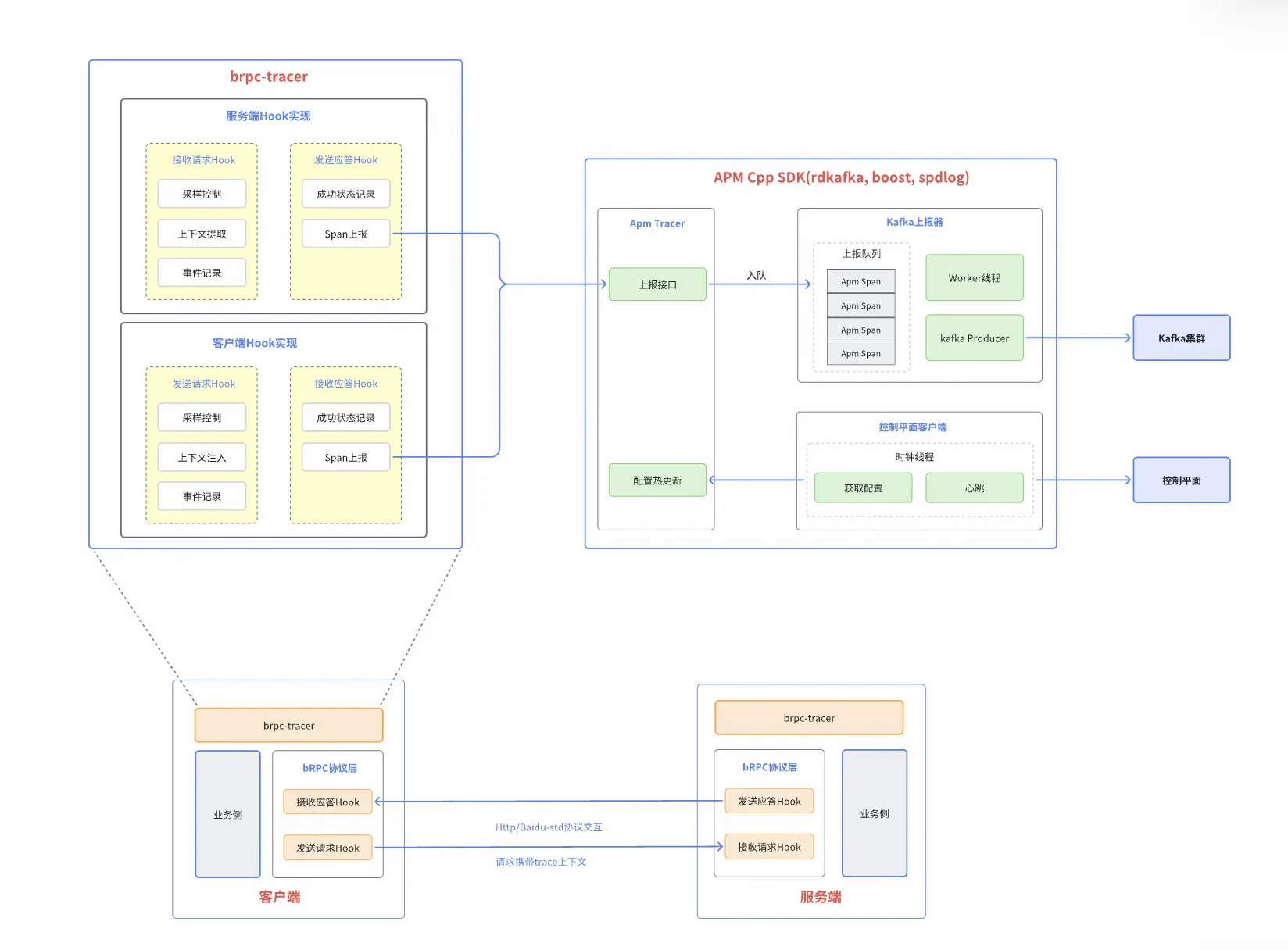 - APM Cpp SDK: 實現Span的創建、採集和上報,同時與控制平面對接實現心跳和配置熱更新,基於kafka上報Trace。