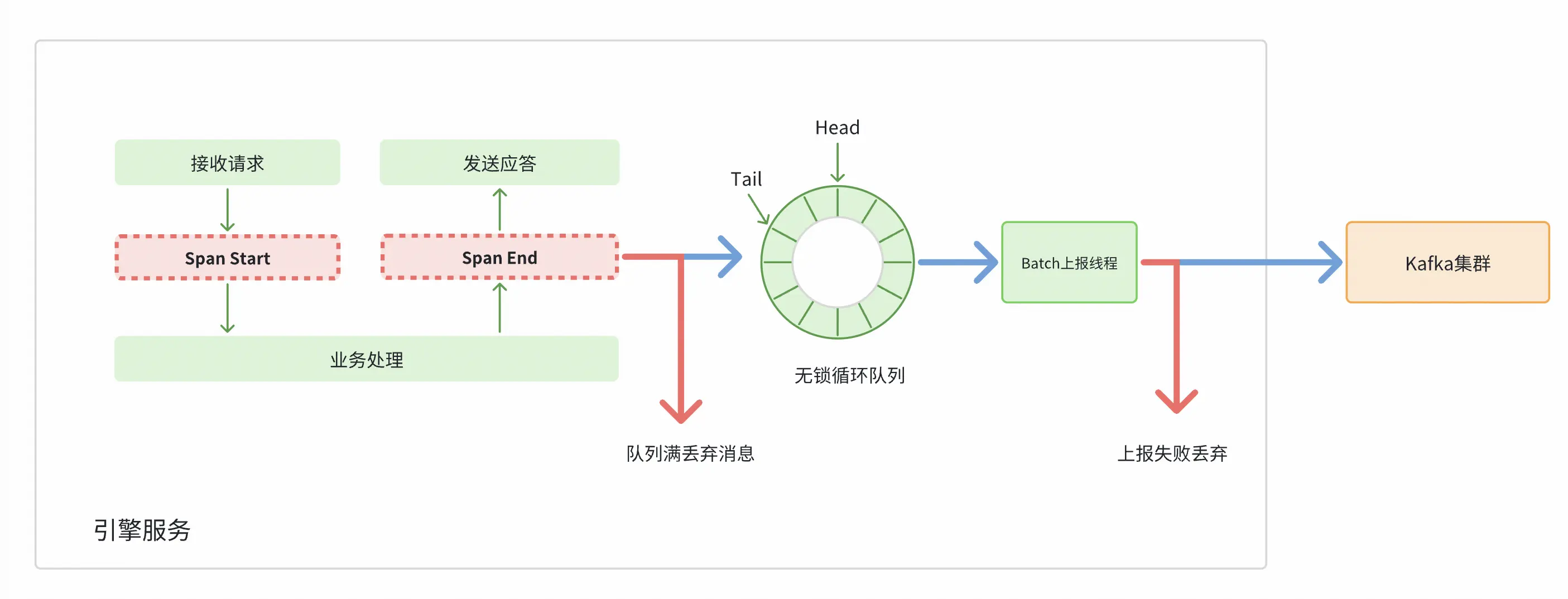 - 異步上報: Span採集後寫入隊列,由異步線程批量處理並投遞至Kafka;當隊列已滿或上報失敗時直接丟棄,避免阻塞業務線程及內存膨脹。
