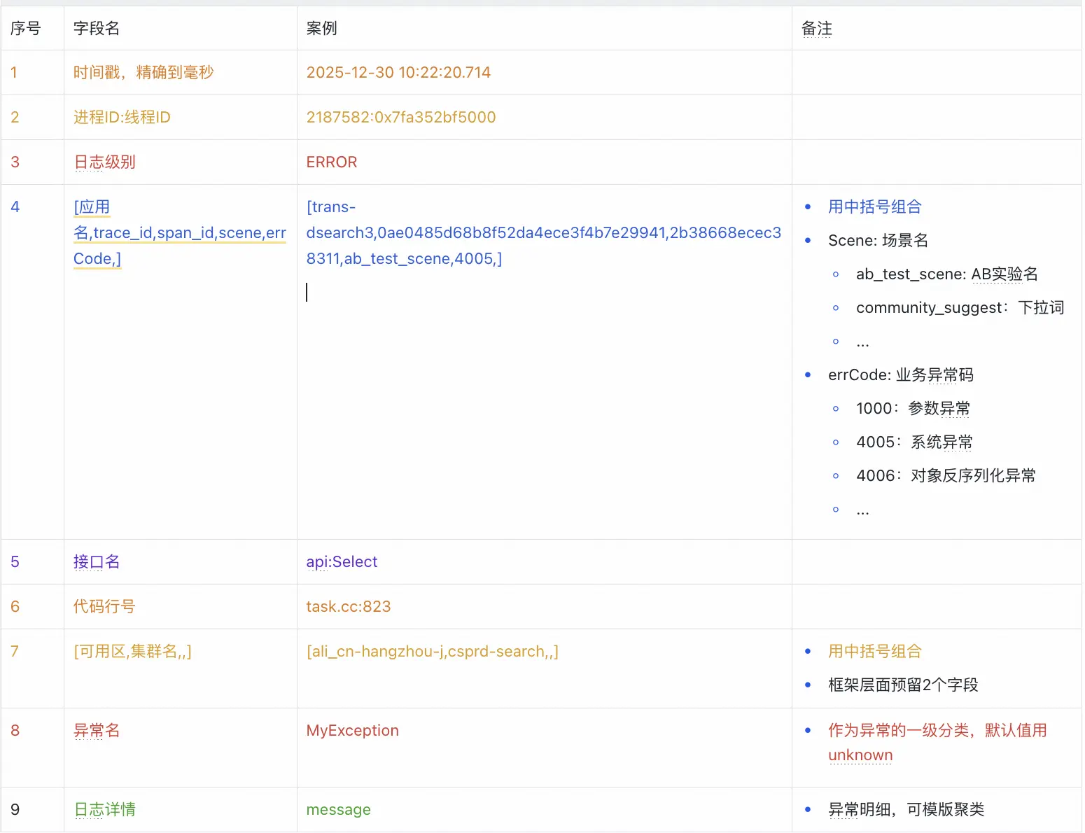業務語義錨定:在日誌規範中首次引入了"場景 (Scene) + 異常碼 (Error Code)"。