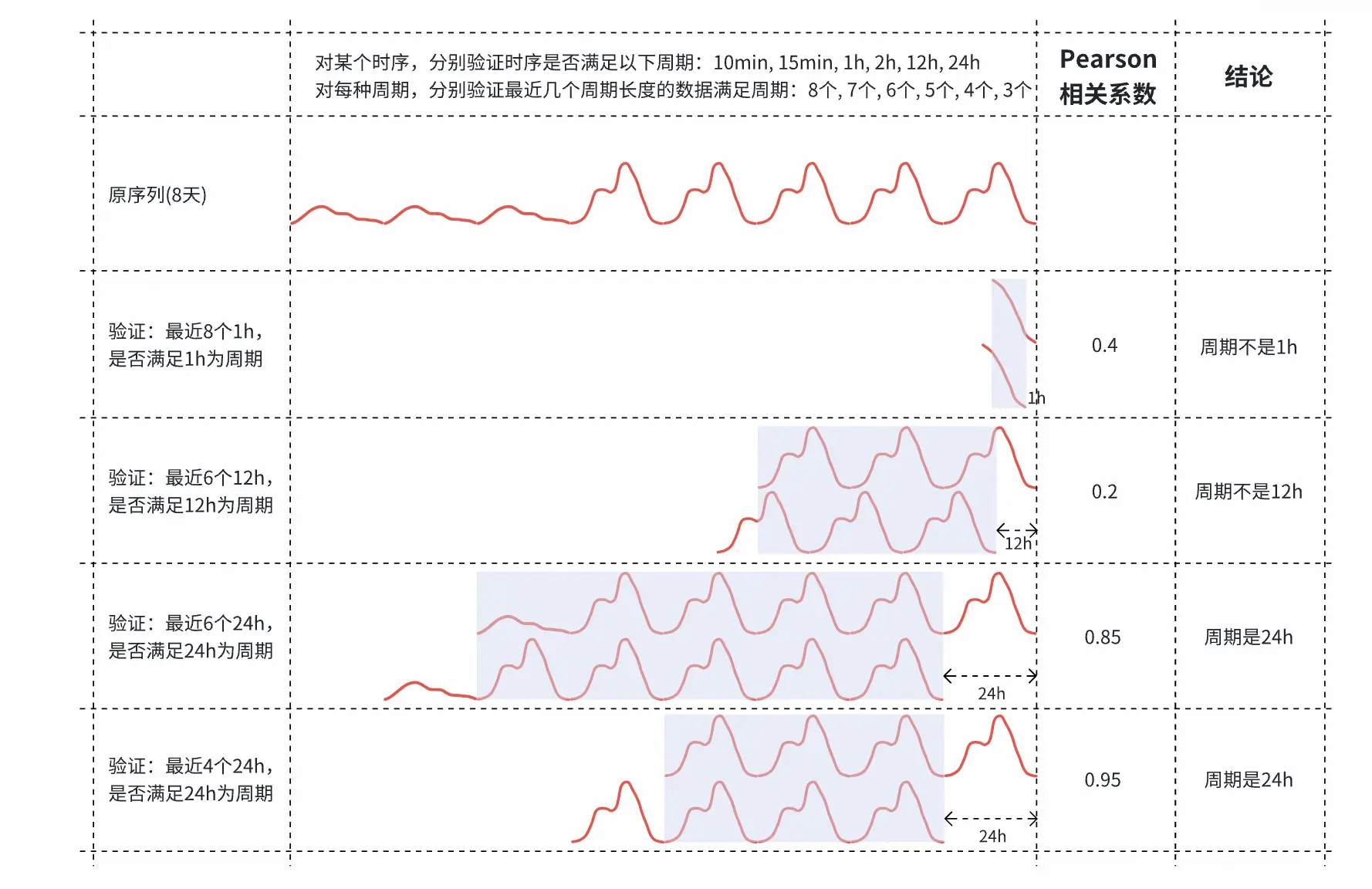 給定一些候選週期,通過計算時間序列的滯後1週期的自相關性,驗證時間序列是否匹配候選週期。對不同的候選週期,取不同長度的歷史數據,候選週期越大,需要歷史數據越久遠,相關性要求較低。