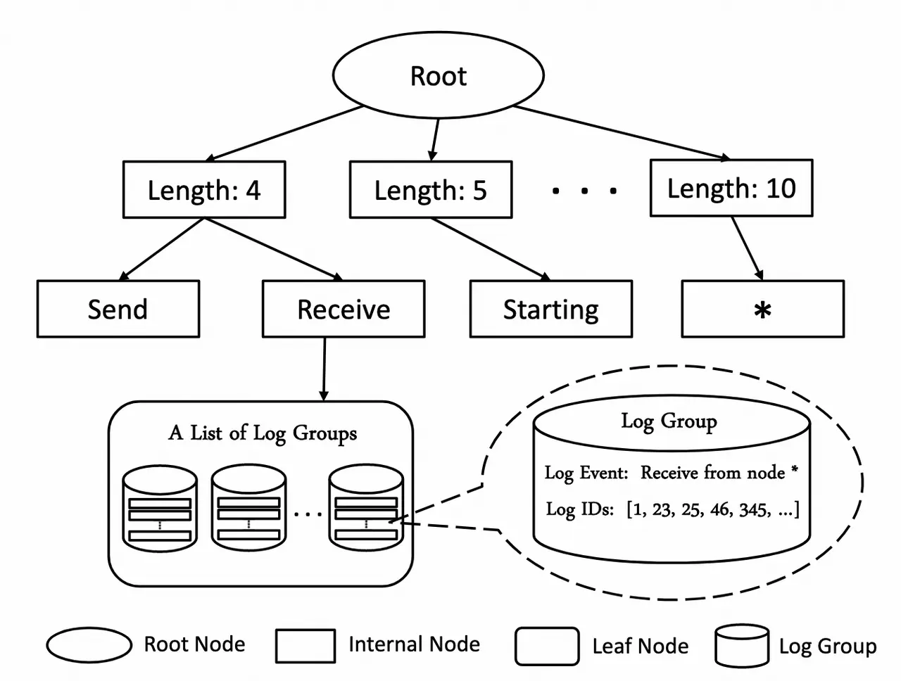 - 然後在樹的後續層級中,每一層級都嘗試根據其他的靜態關鍵字對日誌消息進行進一步細化分類。
