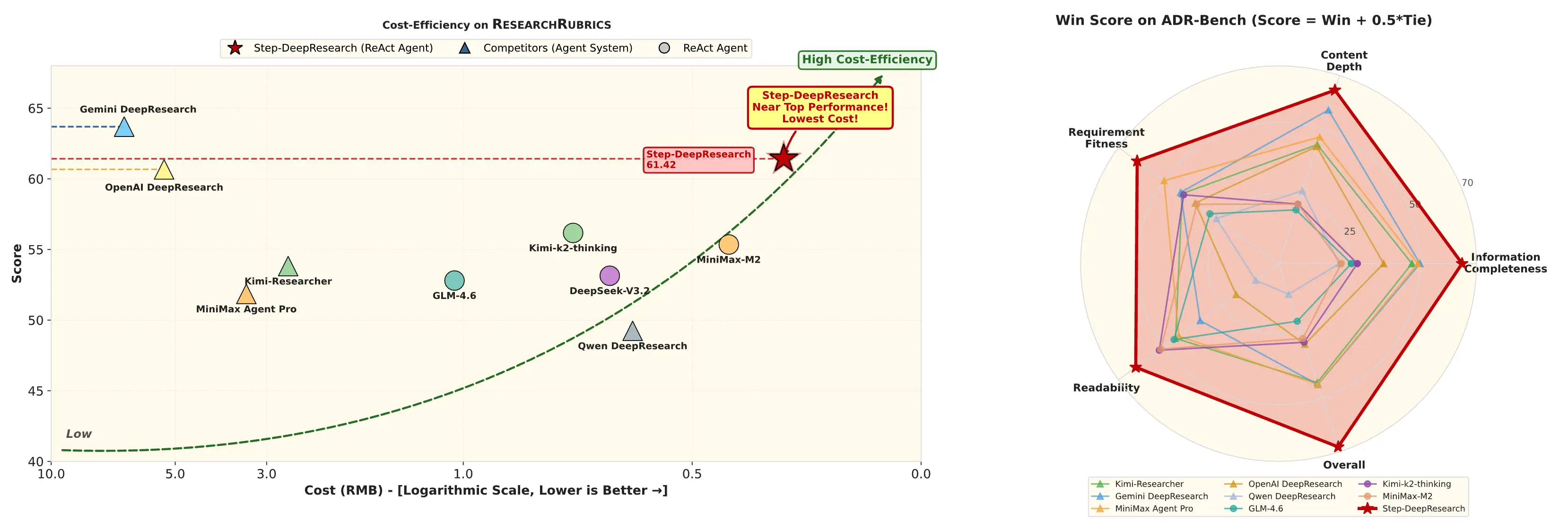 - 卓越的成本效益:Step-DeepResearch 部署和推理成本極低,同時保持專家級的研究能力,是目前業內最具成本效益的深度研究代理解決方案。
