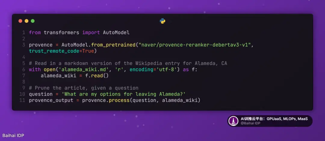 Provence 速度快、準確率高、使用簡單,且體積相對小巧 ------ 僅 1.75 GB。你只需幾行代碼即可調用它,例如: