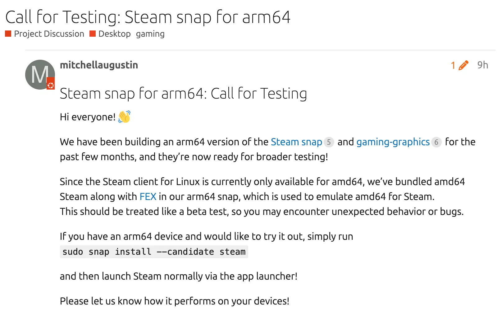 Ubuntu 背後的 Canonical 工程團隊發佈了適用於 ARM64 平台的 Steam Snap 軟件包,通過內置 FEX 仿真層讓目前僅支持 x86/x86_64 的 Steam 客户端能在 ARM Linux 系統上運行,這對於 NVIDIA、Snapdragon、Apple Silicon 等 ARM 硬件 Linux 用户來説是一個重要突破。