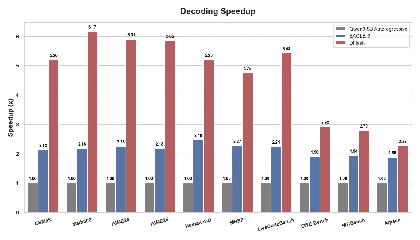 官方數據顯示,DFlash 在 Qwen3-8B 上實現了高達 6.17倍 的無損加速,其解碼速度比目前最先進的推測解碼方法 EAGLE-3 快近 2.5倍。目前,該項目已開源併發布了適配 Qwen3-4B 和 Qwen3-8B 的模型,相關論文即將發佈。
