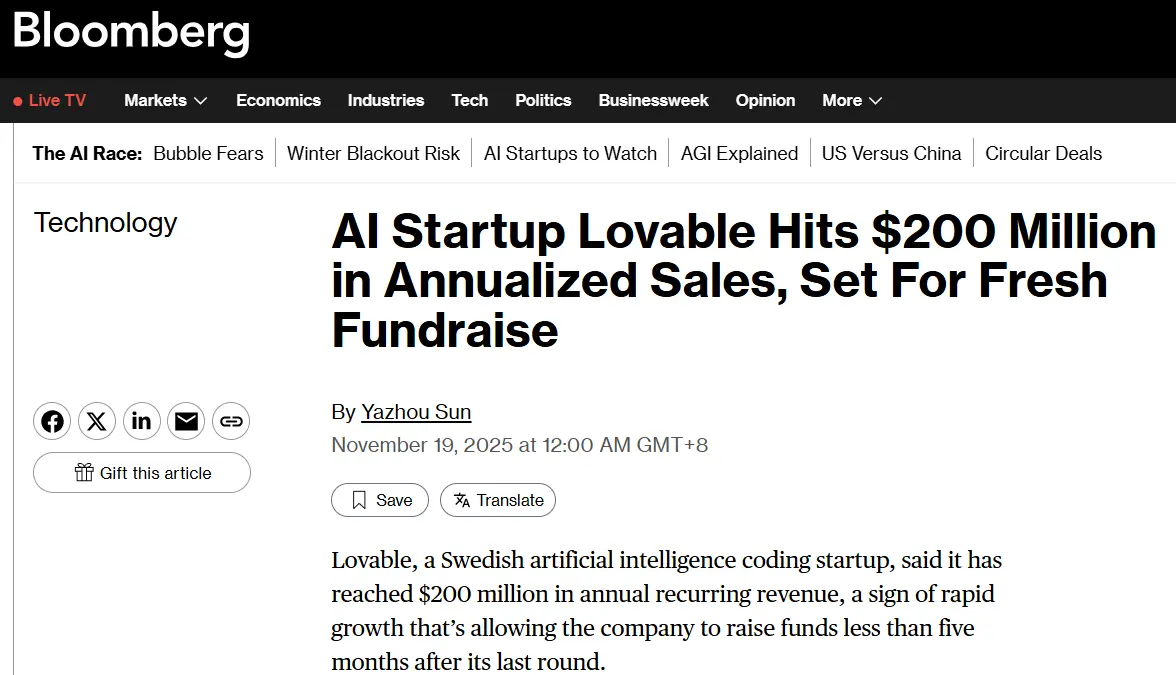 Lovable 聯合創始人兼 CEO Anton Osika 宣佈公司年度經常性收入(ARR)僅用四個月就從 1 億美元倍增至 2 億美元,刷新歐洲 SaaS 增速紀錄。這家一年前在斯德哥爾摩成立的“氛圍編程”平台總計融資逾 2.25 億美元,最新估值 18 億美元。