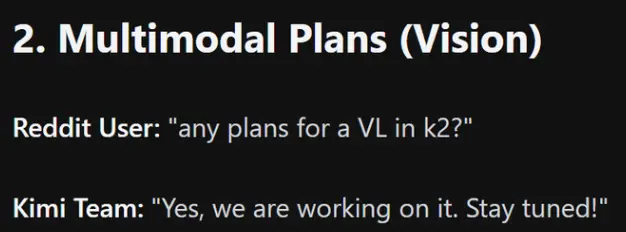 此前,月之暗面方面曾公開表示,公司正在推進視覺 - 語言融合方向的模型研發。根據《科創板日報》的報道,Kimi 計劃在今年一季度上線多模態新模型,型號可能為 K2.1 或 K2.5。