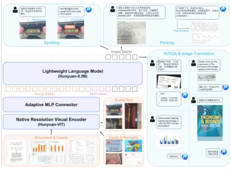 HunyuanOCR 主要由三大核心組件構成:原生分辨率視頻編碼器、自適應視覺適配輕量化混元語言模型。與市面上其他 OCR 模型不同的是,Hunyuan 採用了全端到端的訓練和推理方式,並通過規模的應用導向數據以及在線強化學習,展現了出色的推理能力。