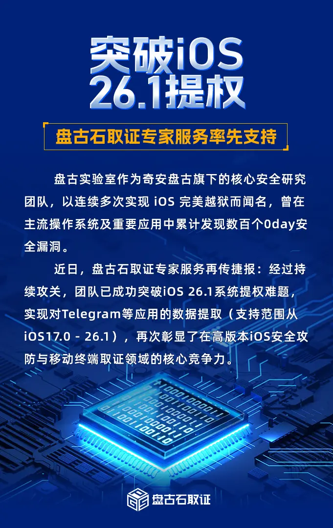 奇安信旗下“盤古石取證”團隊宣佈已成功突破蘋果 iOS 26.1 系統提權難題,實現對 Telegram 等應用的數據提取(支持範圍從 iOS 17.0-26.1)。 據瞭解,“盤古石”團隊是奇安信科技集團股份有限公司旗下專注於電子數據取證技術研發的團隊,產品涵蓋計算機取證、移動終端取證、網絡空間取證、IoT 取證、取證數據分析平台等電子數據取證全領域產品和解決方案。
