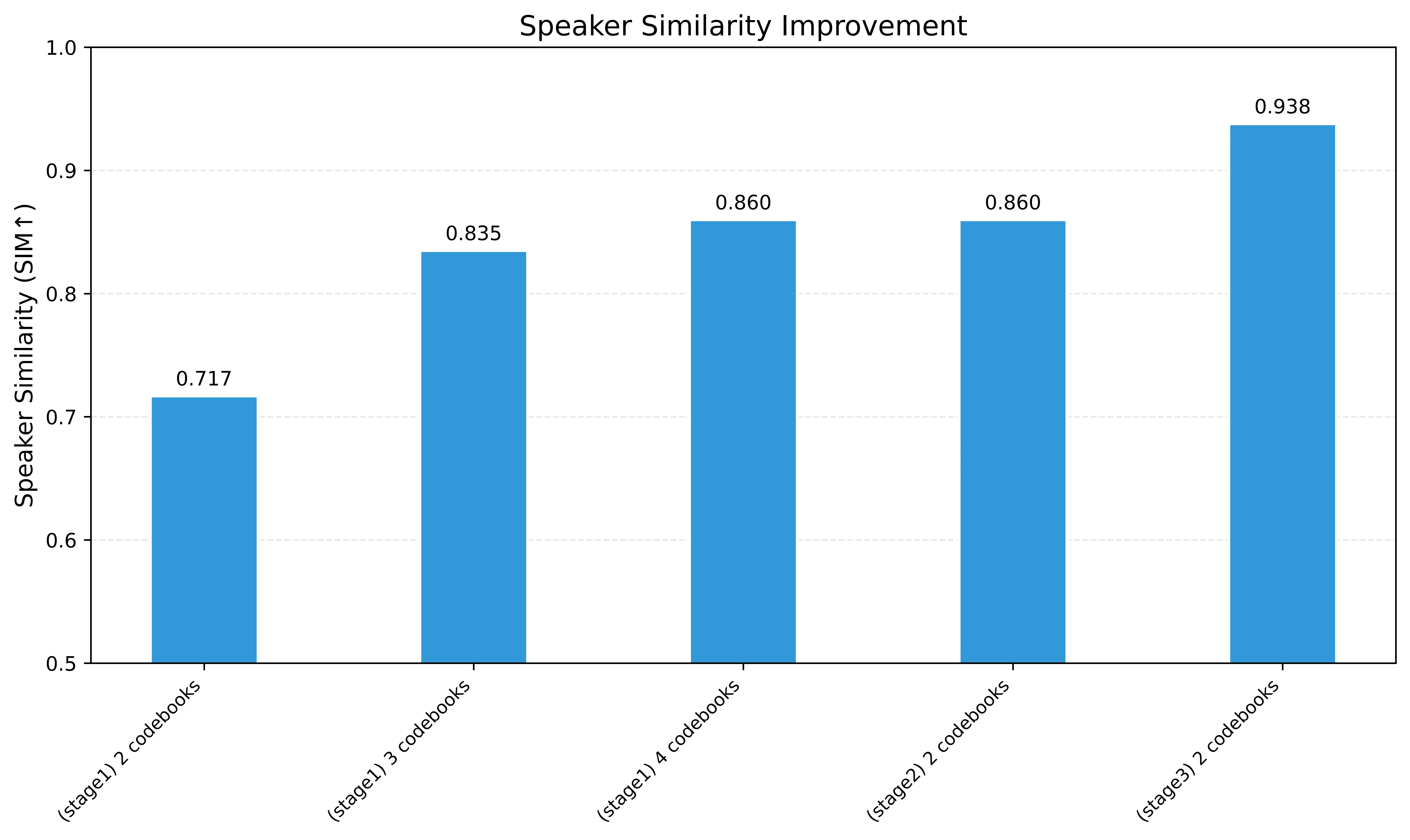 經過 Stage 3 優化後,有限集説話人相似度(SIM)從 0.717 升至 0.938,證明在當前架構下,使用最低碼率(0.43kbps)下也可滿足説話人定製需求。