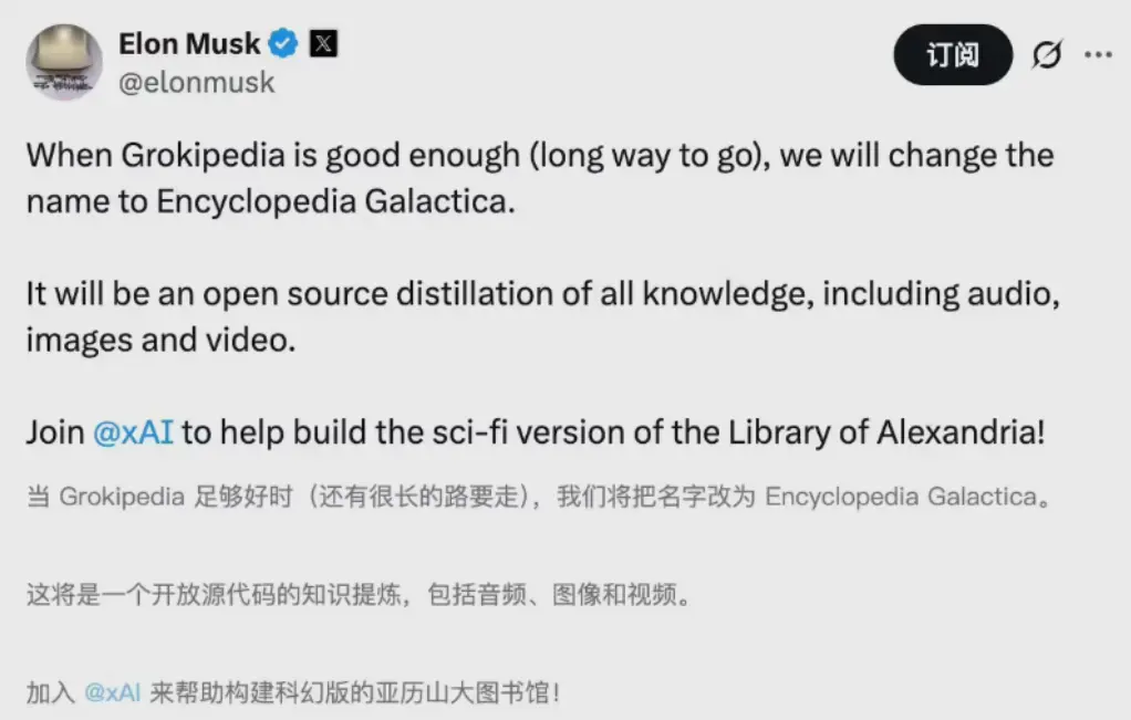 xAI創始人埃隆·馬斯克在接受Baron Capital專訪時將公司10月上線的AI百科全書“Grokipedia”定位為“現代亞歷山大圖書館”,承諾項目完全開源,並計劃將知識庫刻錄在穩定氧化物介質後送往月球、火星及更遠深空,以避免“文明毀滅導致知識再次消失”的悲劇。