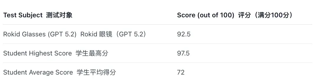 據介紹,AI眼鏡在30分鐘內完成考試,獲得92.5分(滿分100分),超過95%的學生(平均分72分,學生最高分97.5分)。
