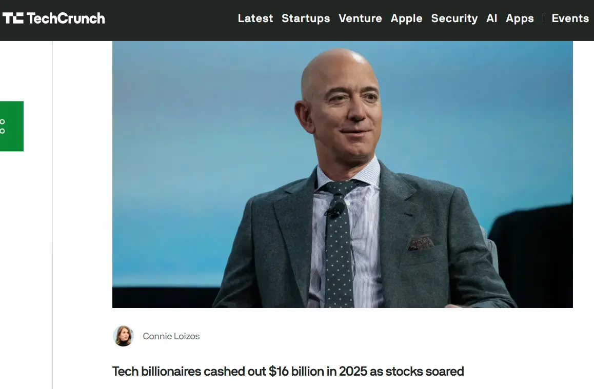 據彭博社對內部交易數據的分析,美股全年科技企業高管套現總額超 160 億美元。其中,亞馬遜創始人貝索斯於 6 月和 7 月出售了 2500 萬股股票,以 57 億美元套現額位居榜首;並在此期間與勞倫・桑切斯在威尼斯舉行了婚禮。