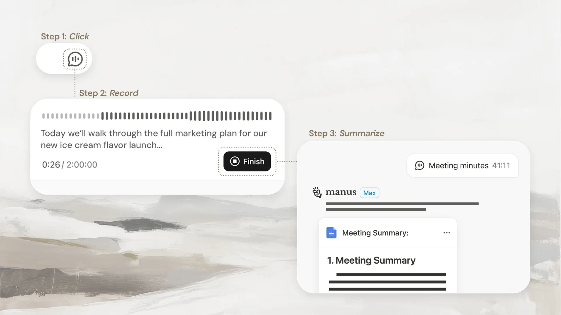 只需輕輕一點,您就可以錄製任何面對面會議、訪談或獨白。錄製完成後,Manus 會分析對話內容,並提供重要信息的結構化摘要:關鍵要點、與會人員以及清晰的待辦事項分解。