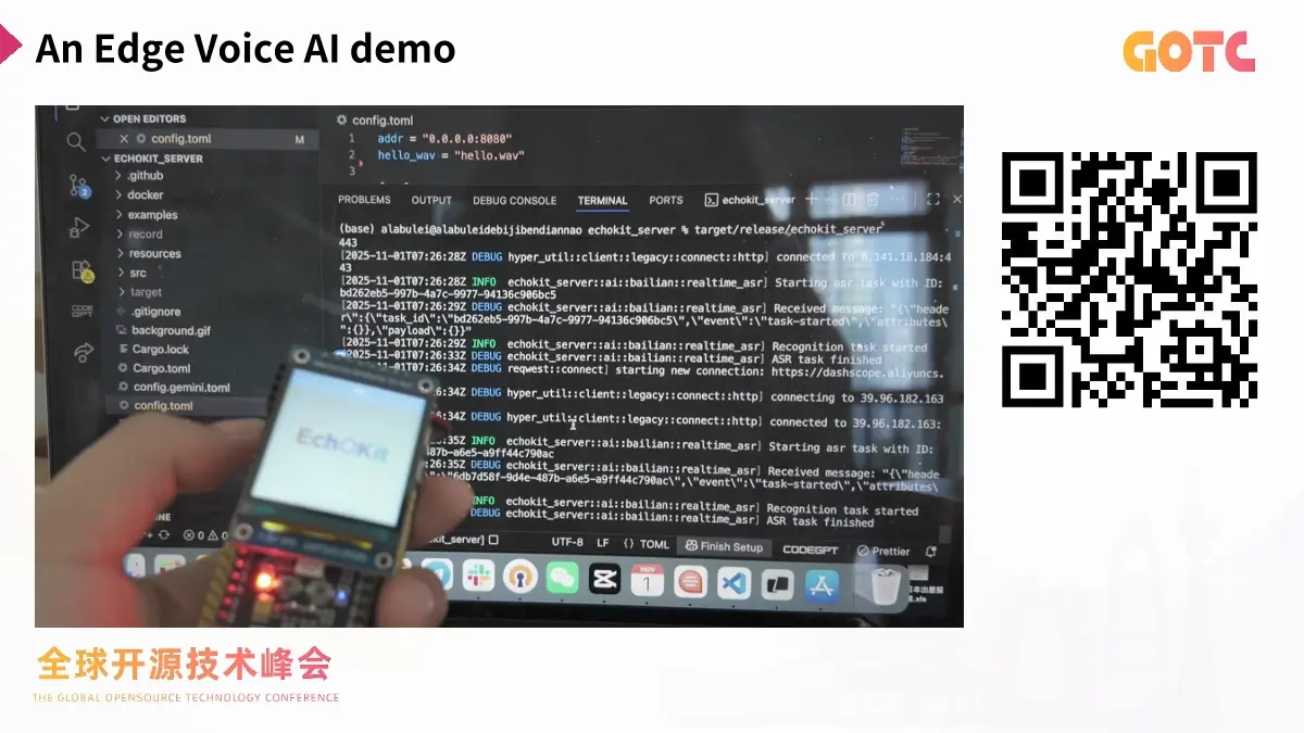 分享從介紹硬件實踐案例 EchoKit 開始。這是一套基於 ESP32 的低功耗設備方案,能承擔本地的小模型任務,如 VAD 與喚醒詞。同時,它配套的 EchoKit Server(由 Rust 編寫)能在雲端或局域網中調度本地與遠程 AI 服務,通過一個簡單的二進制文件與 YAML 配置完成部署,支持容器化運行。對於構建語音設備的團隊來説,硬件與服務端協同的能力尤為關鍵。