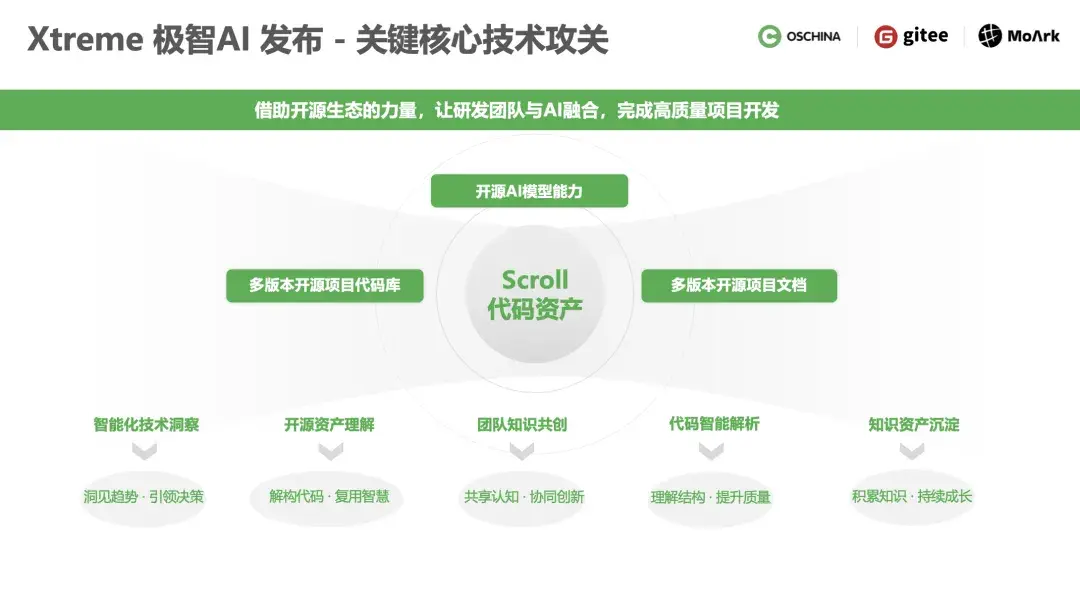 平台配套的 Xtreme 極智 AI 系統,通過對開源代碼資產的解析與理解,提供趨勢洞察、知識沉澱、結構複用等研發智能能力。通過「Scroll 引擎」與「研發數據飛輪」的閉環設計,使企業研發過程更透明、更復用、更具決策力。