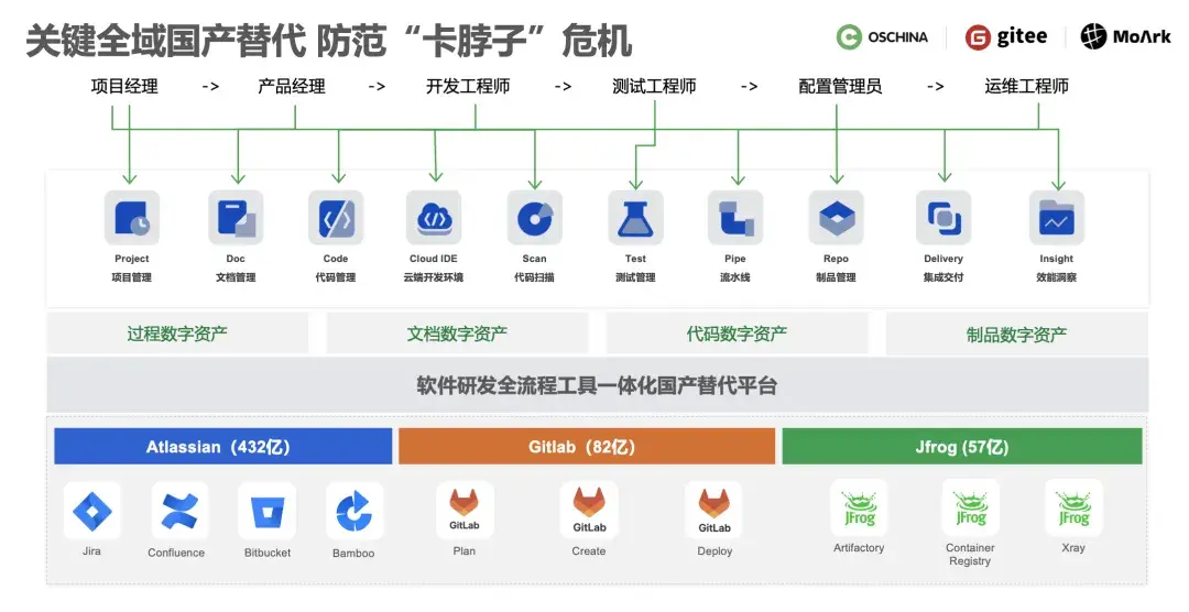 為應對傳統 DevOps 工具鏈的「卡脖子」困境,Gitee 推出了全流程 DevOps 平台,已完成對 Atlassian、GitLab、JFrog 等海外工具的功能級替代,支持項目管理、版本控制、測試執行、構建制品、交付部署與效能洞察。
