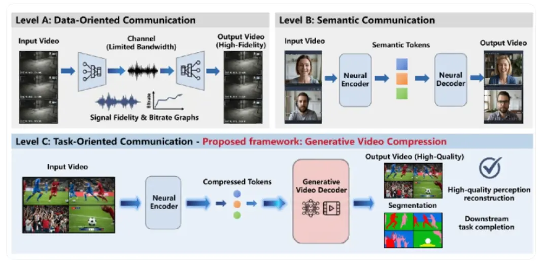 這項技術的核心邏輯被稱為“用計算換帶寬”。與傳統視頻編碼(如 H.265或 H.266)依靠“搬運像素”的邏輯不同,GVC 不再傳遞完整的畫面像素,而是傳遞“如何畫出畫面”的指令。這些極小的數據包被稱為“壓縮 Token”,其中包含了畫面的語義信息(場景、物體結構)和運動信息(動作趨勢)。
