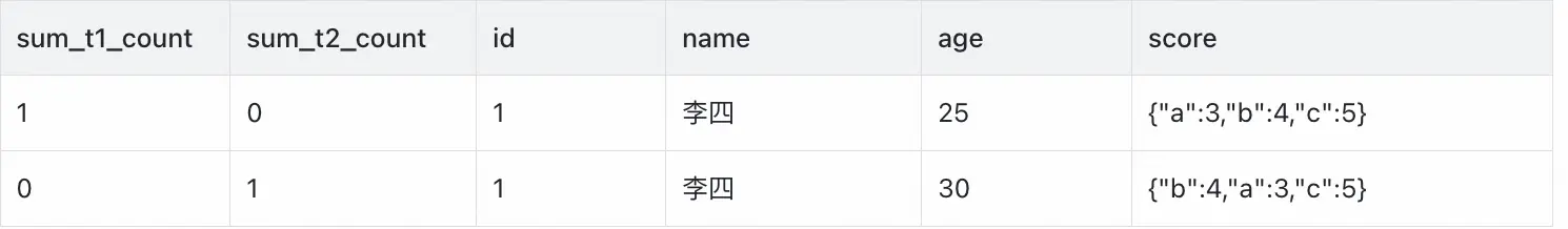 通過以上結果表可以得出兩表的age字段不一致 ,score不一致(但按key排序後一致)。