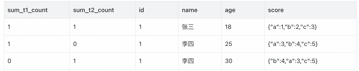 select 1 as _t1_count, 0 as _t2_count, `id`, `name`, `age`, `score`