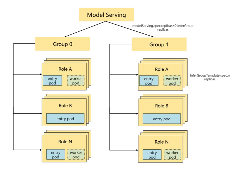 - LLM工作負載三層架構設計:ModelServing > ServingGroup -> Role,一個API,支持LLM原生部署、PD分離部署,乃至大EP部署等多種部署形態,簡化管理多LWS的負擔。例如對於PD分離的大規模部署,可用一個ModelServing表示,根據負載的大小每個ModelServing可以包含任意數目的 ServingGroup(xPyD 分組), 每個ServingGroup包含多個角色(Prefill Decode,他們通常部署在同一個超節點內以提升推理性能),相同的角色可以等價為一個LeaderWorkerSet,支持TP/PP/EP等多節推理並行計算。