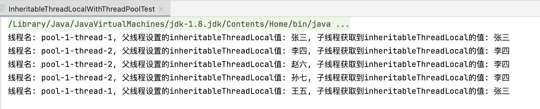 | 提交第三個異步任務值為【王五】 | 複用Thread:pool-1-thread-1 | 沒有自動繼承父線程的InheritableThreadLocal值【王五】,所以拿到了第一個任務提交時Thread繼承下來的值【張三】 |