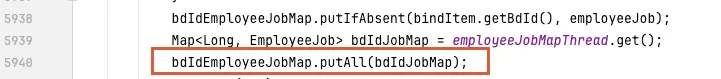 結合堆棧和代碼可以確定是由於bdIdJobMap的值為null導致往bdIdEmployeeJobMap這個map中putAll的時候空指針了。
