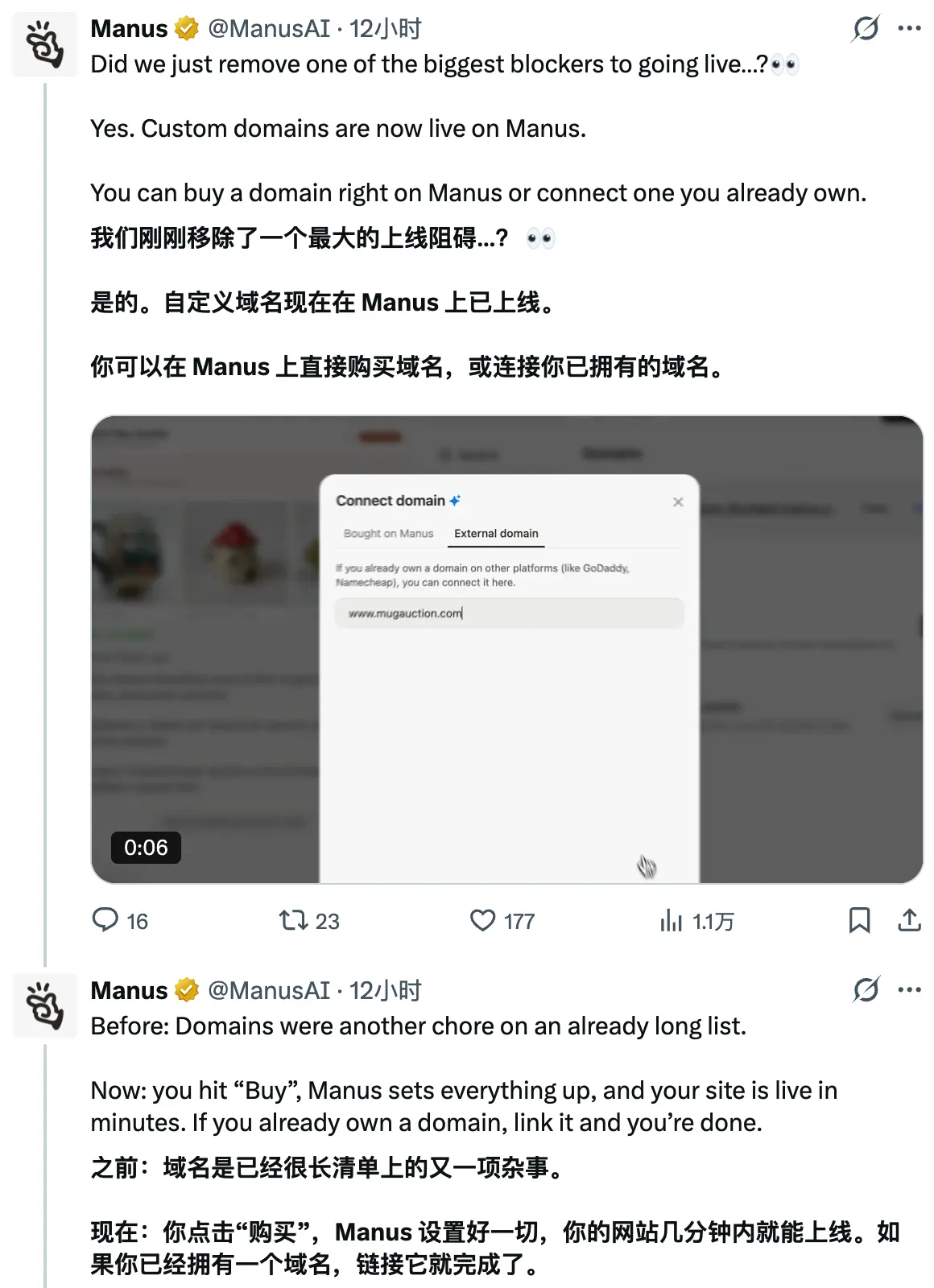 通用智能體平台 Manus 宣佈了一項重要更新,其自定義域名功能現已正式上線。 點擊“購買”,Manus 會幫你完成所有設置,你的網站幾分鐘內就能上線。如果你已經擁有域名,只需關聯一下就完成了。 根據介紹,該功能允許用户在平台內直接購買新的域名,或者將自己已經擁有的域名連接到 Manus 服務,從而提升品牌形象和用户訪問的便捷性。