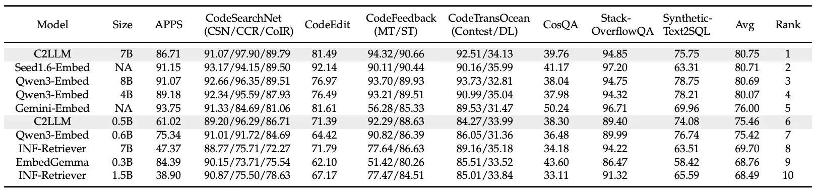 C2LLM-7B:總分高達 80.75,在所有開源和閉源模型中排名第一,尤其在面向代碼的複雜自然語言查詢任務上表現出色。