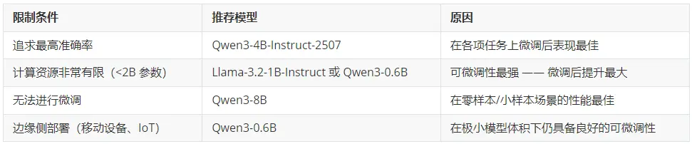 微調後性能最佳的模型:Qwen3 系列模型在微調後始終表現最強,其中 4B 版本整體表現最優。如果你的目標是在特定任務上獲得最高準確率,Qwen3-4B 就是你的首選。