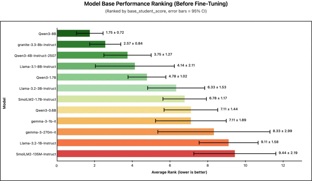 近期,distil labs 團隊進行了一項嚴謹的基準研究,或許能為你提供數據驅動的答案。他們在 8 類任務(涵蓋分類、信息抽取、開卷與閉卷問答)上,對 12 個主流小型模型(包括 Qwen3、Llama、Gemma、Granite、SmolLM 等系列)進行了統一微調與評估,並對比了其與 120B 參數教師模型(GPT-OSS-120B)的性能差異。