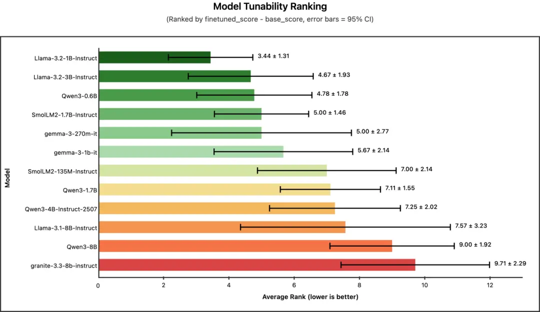 有趣的是,可微調性排名與模型大小的排序正好相反。像 Llama-3.2-1B 和 Qwen3-0.6B 這樣的小型模型,從微調中獲得的提升最大。而規模最大的模型(如 Qwen3-8B、granite-3.3-8b)在可微調性排名中接近墊底 ------ 這並非因為它們表現差,而是因為它們起點相對較高,進步空間相對有限。