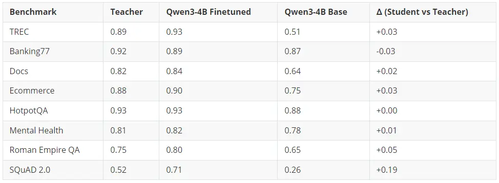 經過微調的 4B 學生模型在 6 項基準測試上超越了 120B+ 參數的教師模型,在 1 項(HotpotQA)上持平,僅在 1 項(Banking77)上略微落後(差距在誤差範圍內)。提升最顯著的是 SQuAD 2.0 閉卷問答任務,學生模型比教師模型高出 19 個百分點 ------ 這充分證明,微調比單純依賴提示詞(prompting)能更有效地將領域知識注入模型。