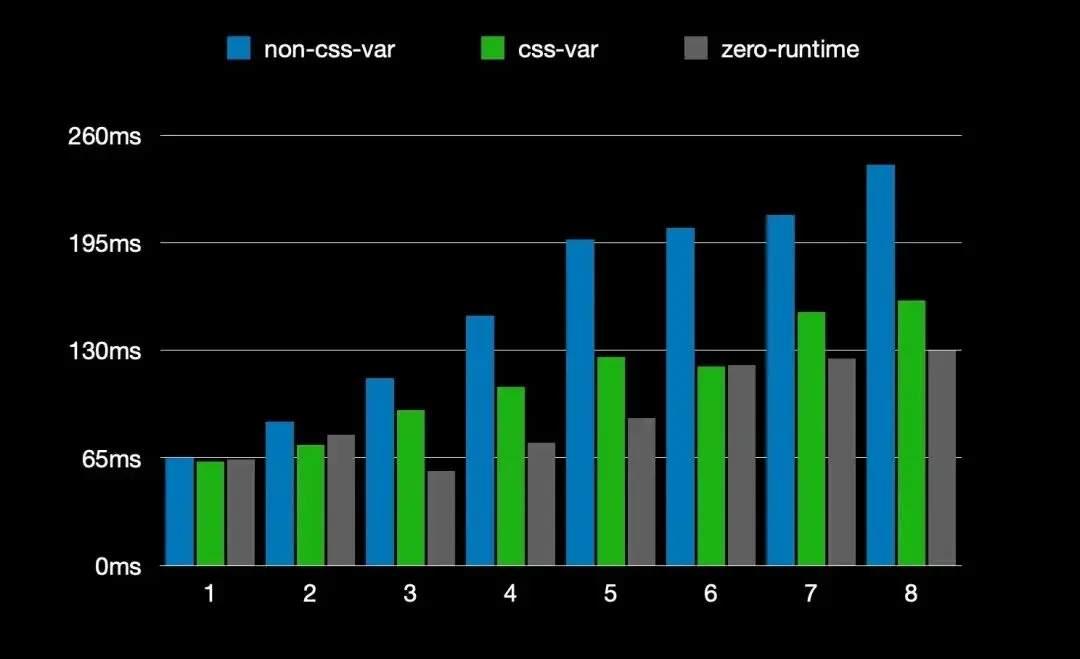 性能對比如下,zeroRuntime 模式表現最佳(水平軸為主題數量):