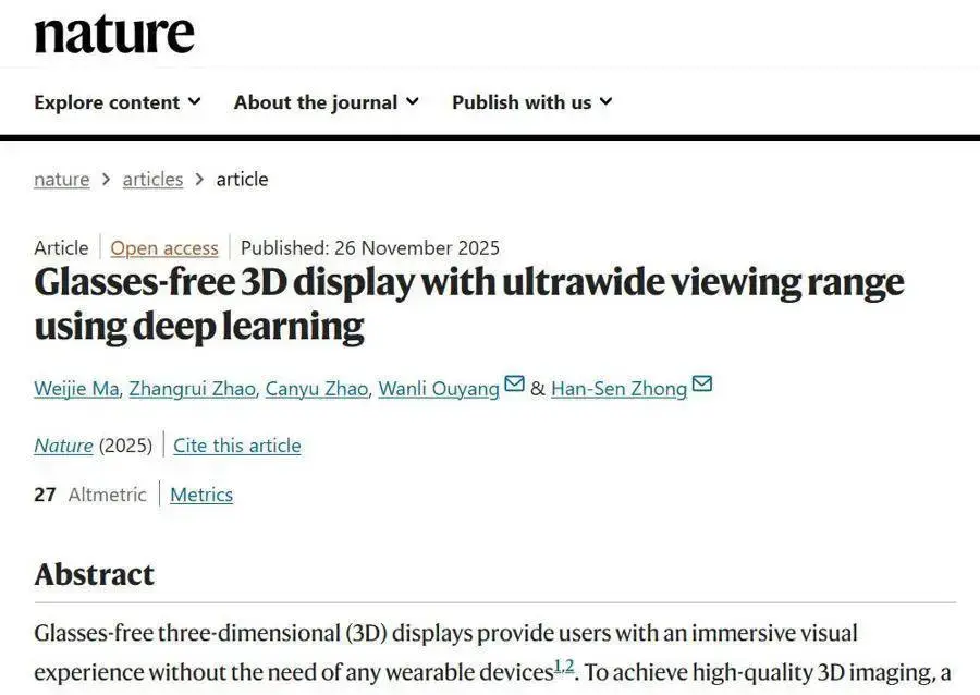 國際頂級學術期刊《Nature》正刊發表該成果相關論文並評價其為“光學信息運用的全新範式”。傳統裸眼3D顯示技術以靜態方式將有限信息量均勻分配至所有可視角度。而EyeReal開創了動態模式——通過AI驅動引擎,將全部信息量實時聚焦於觀看者視線落點,由此突破了既往技術中的權衡關係。