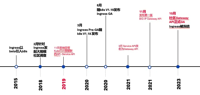 Ingress 規範本身從 2015 到 2020 年 8 月,隨着 Kubernetes v1.19 的發佈才被正式 GA,跨越了約 5 年時間。而實際上,就在 Ingress 規範 GA 之前,2018 年 2 月社區針對 Ingress 發起過大規模的社區調查,隨後在 2019 年 11 月聖地亞哥的 KubeCon 上,一個新的 API:Service API 被提出,這個 Service API 就是 Gateway API 的前身,2023 年 10 月 Ingress API 最終被社區正式凍結,推薦用户轉向 Gateway API 規範。