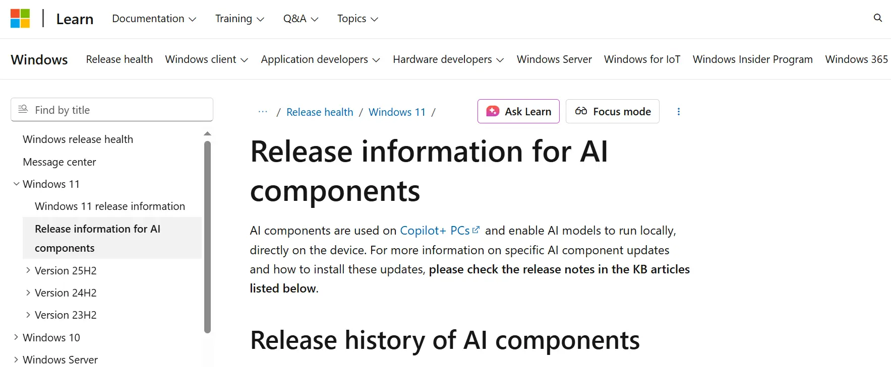 微軟為 Windows 11 AI+ PC 設備正式上線全新 “AI 組件發佈信息”(AI Component Release Notes)頁面,獨立記錄 AI 模型的版本更新日誌,其形式與傳統的Windows系統補丁説明並列。