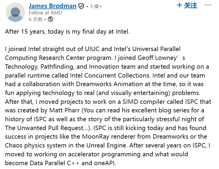 英特爾資深編譯器專家 James Brodman 日前在 LinkedIn 上宣佈從英特爾離職,如已被證實加入了 AMD 擔任研究員。