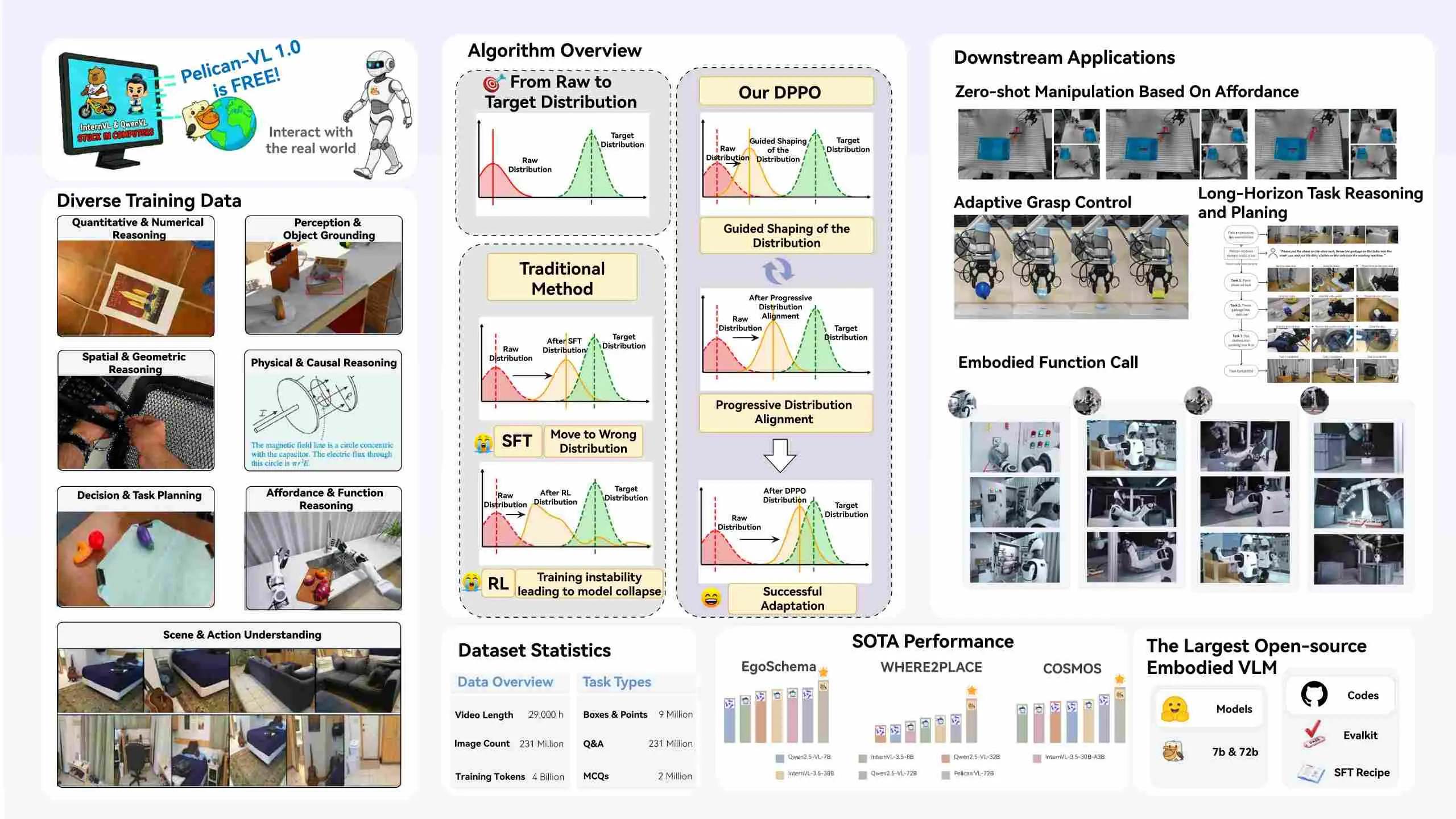 另外值得注意的是,Pelican-VL的核心主創團隊都是由女性組成,這也充分體現了女性力量在我國科技研發中的重要貢獻。該團隊還提出了一套全新的DPPO(刻意訓練)訓練範式,是全球首創的具身多模態大模型後訓練自進化算法框架。憑藉DPPO,Pelican-VL 實現【性能最強】這一目標使用的數據量為200K,僅僅是其他大模型的1/10甚至1/50,是名副其實的開源VLM性價比之王。