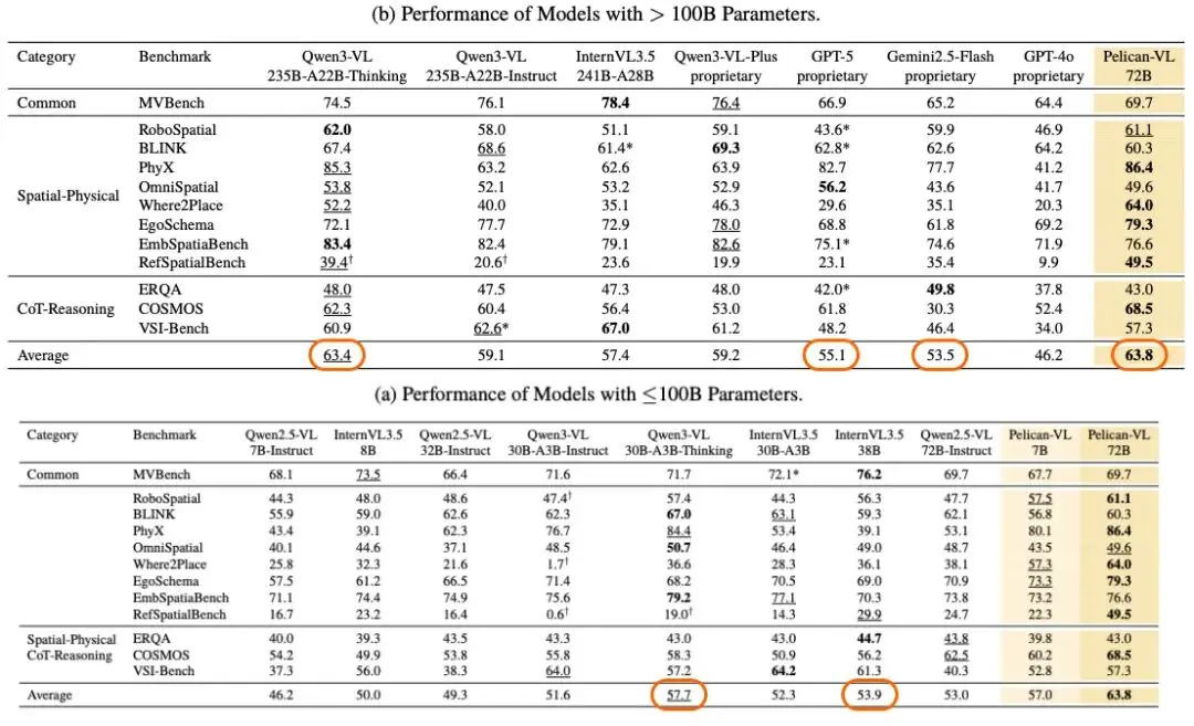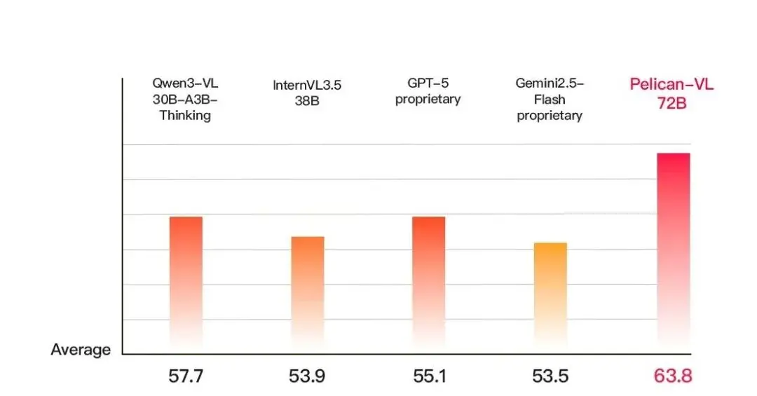 北京人形機器人創新中心全面開源具身智能VLM模型——Pelican-VL 1.0。該模型覆蓋7B、72B參數規模,是迄今為止“最大規模的開源具身多模態大模型”,同時,也是迄今為止全球性能最強大的具身智能VLM模型。根據測試,其性能超越GPT-5 同類模型15.79% ,與Google gemini 系列模型相比提升19.25%,同時也超越通義千問、書生萬象等國內模型,成為了目前最強的開源具身多模態大模型 。