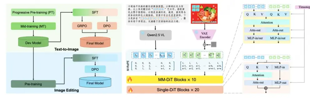 根據介紹,LongCat-Image 採用文生圖與圖像編輯同源的架構設計,並結合漸進式學習策略,在僅 6B 的緊湊參數規模下,實現了指令遵循精準度、生圖質量與文字渲染能力的高效協同提升。尤其在單圖編輯的可控性和文字生成的漢字覆蓋度方面獨具優勢。